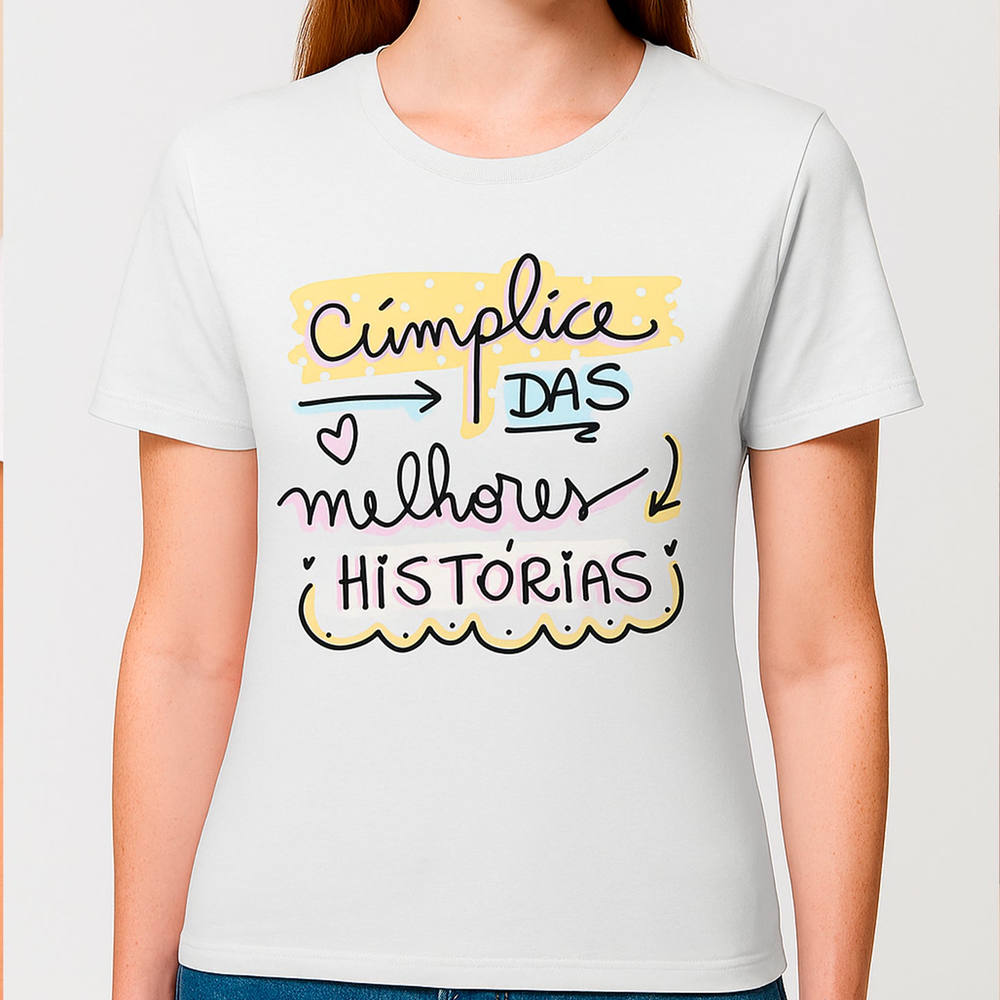 T-shirt em algodão branco com a frase “Cúmplice das melhores histórias” em letras coloridas e divertidas. Perfeita para aquela amiga especial que partilha contigo momentos únicos e inesquecíveis. Confortável, leve e cheia de personalidade.