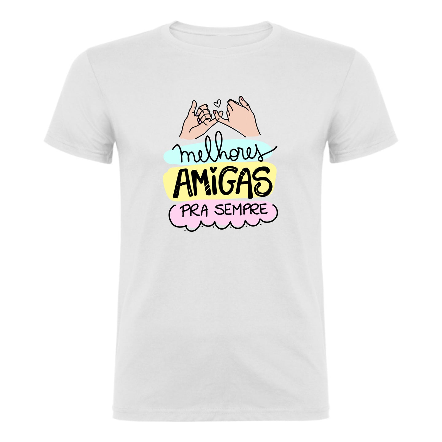 T-shirt em algodão branco com a frase “Melhores Amigas Pra Sempre” e ilustração de mãos entrelaçadas em promessa de amizade. Um presente perfeito para celebrar laços eternos com conforto e estilo.